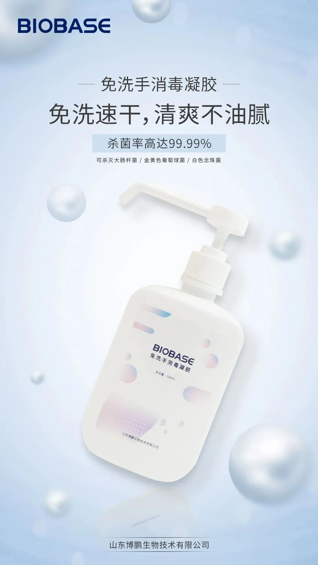 BIOBASE 免洗手消毒凝膠可殺滅大腸桿菌、金黃色葡萄球菌、白色念珠菌,免洗速干,殺菌率達到99.99%。