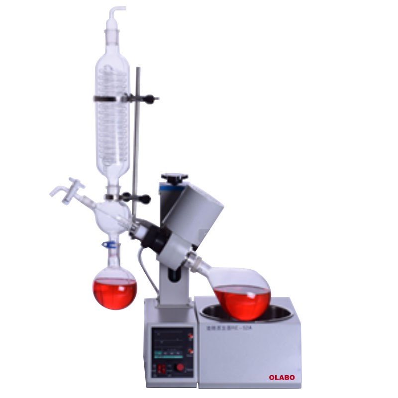 旋轉蒸發器是實驗室廣泛應用的一種蒸發儀器。適用于回流操作、大量溶劑的快速蒸發、微量組分的濃縮和需要攪拌的反應過程等。旋轉蒸發器系統可以密封減壓至400~600毫米汞柱;用加熱浴加熱蒸餾瓶中的溶劑,加熱溫度可接近該溶劑的沸點;同時還可進行旋轉,速度為50~160轉/分,使溶劑形成薄膜,增大蒸發面積。在高效冷卻器作用下,可將熱蒸氣迅速液化,加快蒸發速率。蒸發瓶恒速旋轉,水浴鍋恒溫加熱,在此條件下:物料在蒸發瓶內壁形成大面積均勻薄膜快速蒸發,在真空條件下可以提高蒸發效率(需連接真空裝置),溶媒蒸汽經玻璃冷凝盤管時冷卻成液體(需連接冷卻裝置),回收于收集瓶。本系列產品使用需配套真空裝置(循環水式、旋片式、隔膜式等真空泵),冷卻循環裝置組成系統裝置。
